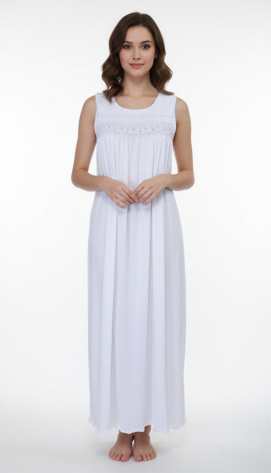 Sleeveless long gown 48", hand smocked and lilac embroidered