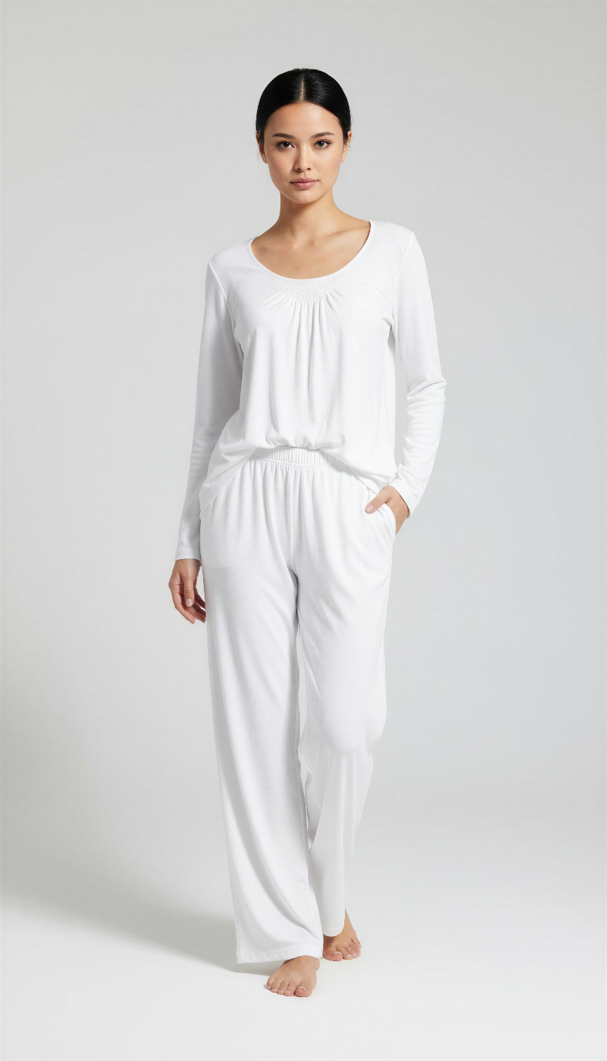 Classic pajama set, long sleeve embroidered top, elastic waistband long pants. (No pockets)