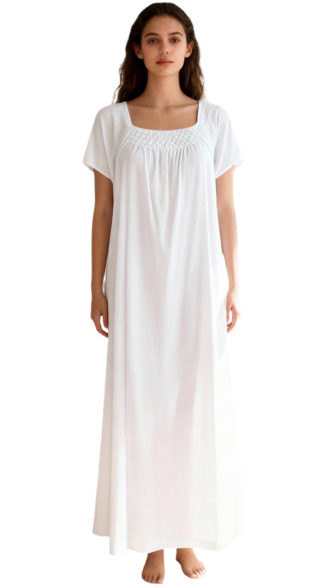Smocked and hand embroidered, short sleeves, long gown 48",