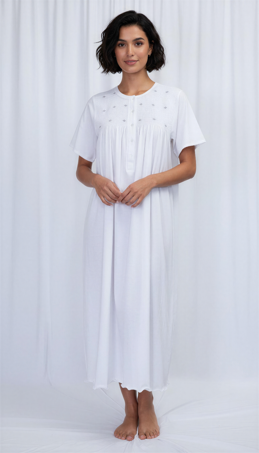 Hand smocked white fine jersey long gown 48", hand embroidered with lilac flowers.
