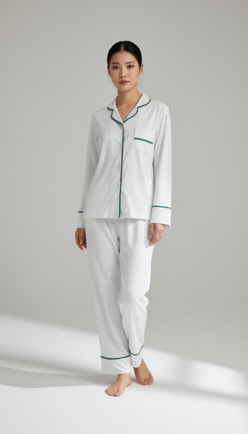 Two-piece pajama set, palazzo pants, long sleeve buttoned top.